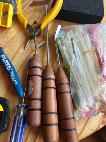 INCLUDES: PRELOVED BUCKET WITH FABRIC TOOL COVER, SHEARS, LASH SAVER, SHAVER W/NEW REPLACEMENT BLADE, BAG OF CLIPS, PINK HANDLE FILE, MINI CUTTING MAT, MINI SIDE CUTTERS, YELLOW HANDLED PLIERS, BANDAID HOLDER, (3) HEAVY DUTY WEAVERITE TOOLS (2 PACKING AND 1 STRAIGHT), 10' TAPE MEASURE, AWL, SMALL ZIP-TIES, AND NEW SANDING BLOCK.